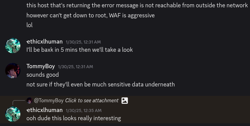Did you catch it? Who is 'organizer.orderinformation.host.net'? We're sending this request on 'orderinformation.host.com'. Then I realized, the path traversal sequence I was sending in the 'detailID' parameter was being appended to a request that's being made to a domain that is only accessible internally. I confirmed this by attempting to reach the domain from my machine, which didn't resolve. At this point I enlisted the help of my hacker friend @ethicxlhuman (a.k.a FuzzGod) as I knew he had also been learning about the bug class lately. It's also just more fun to hack with friends!